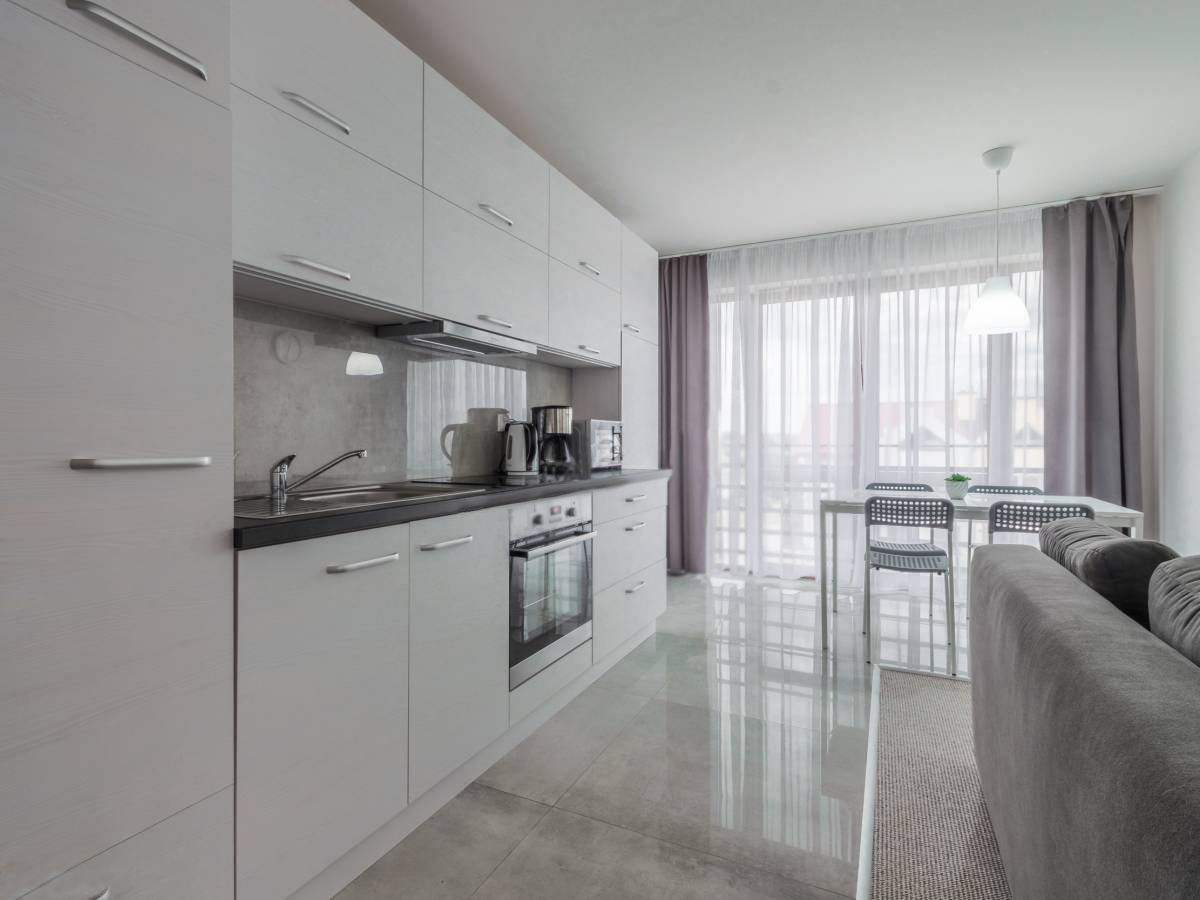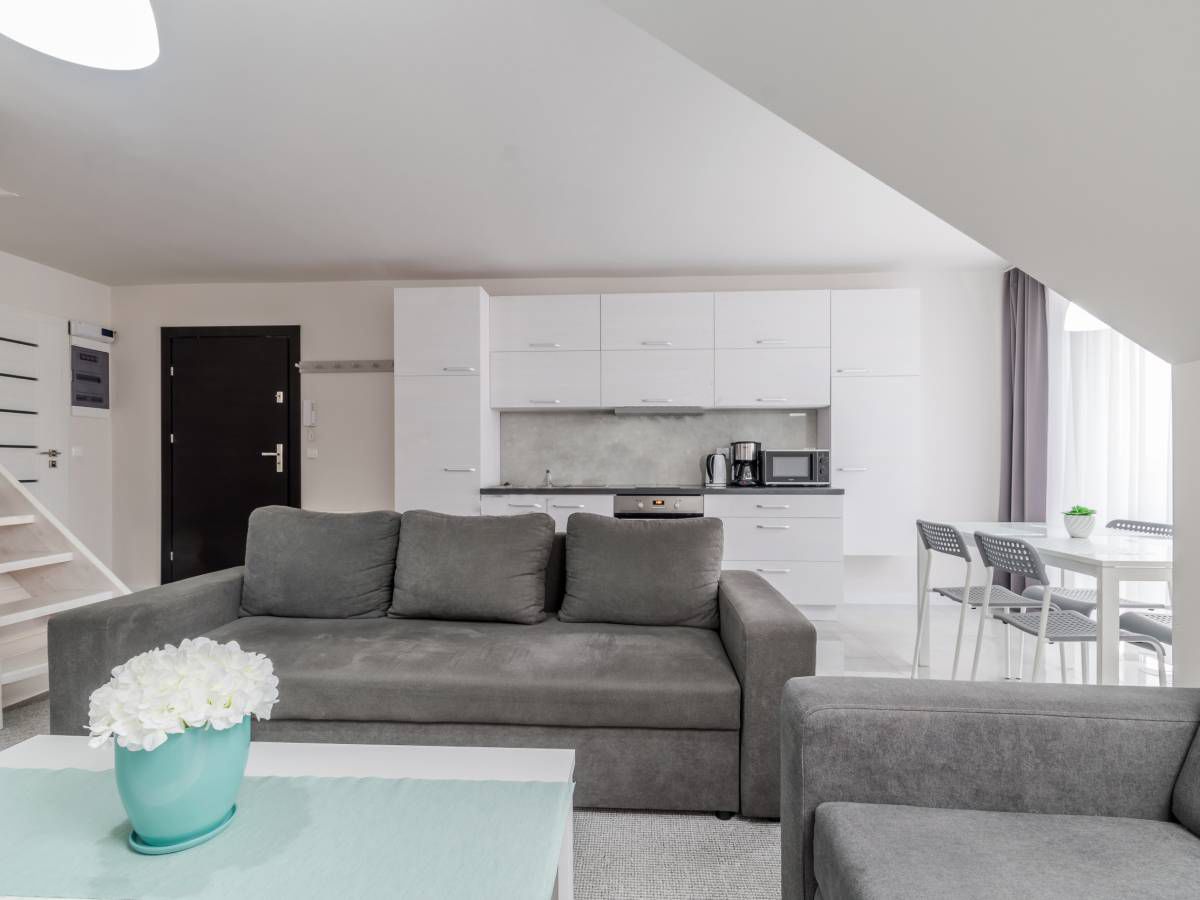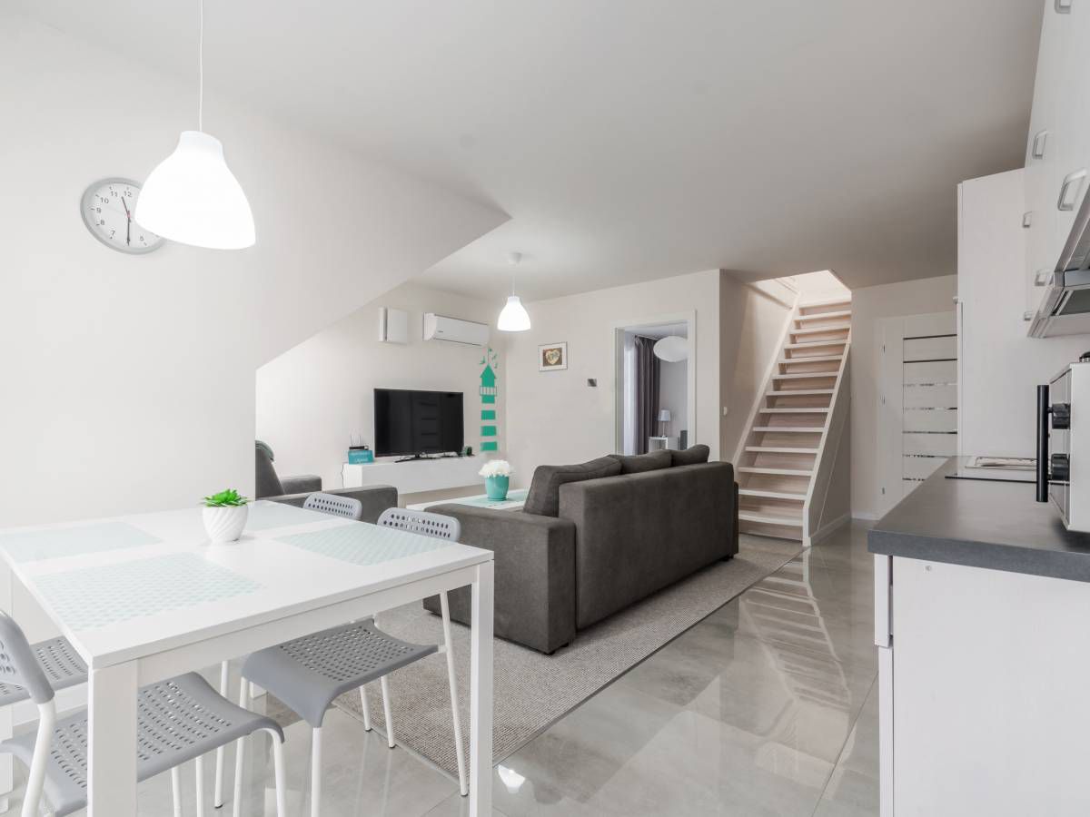 Kuchnia jest kompleksowo wyposażona. Znajduje się w niej płyta grzewcza, piekarnik, mikrofalówka, ekspres do kawy, lodówka oraz zastawa kuchenna, sztućce, garnki, patelnie, kieliszki, szklanki i wszystko, co potrzebne podczas wakacyjnego pobytu.