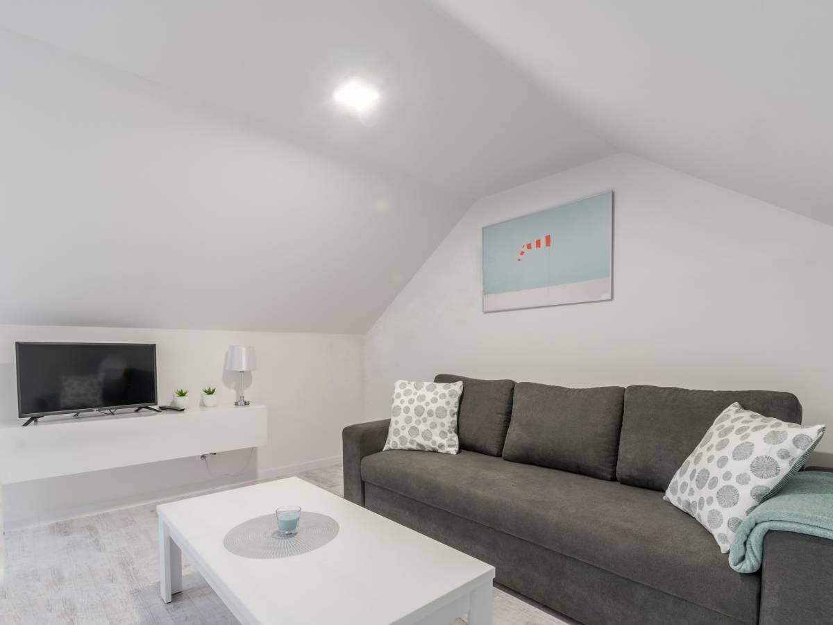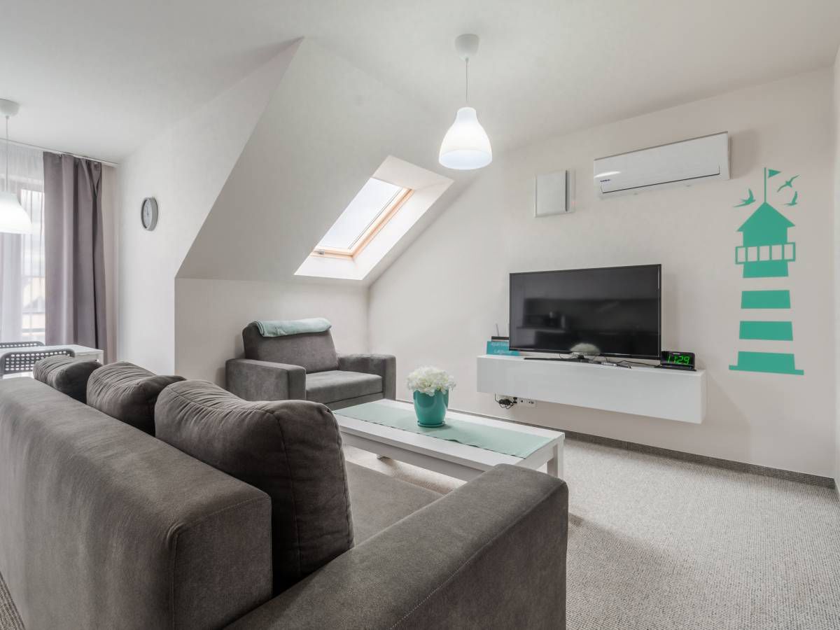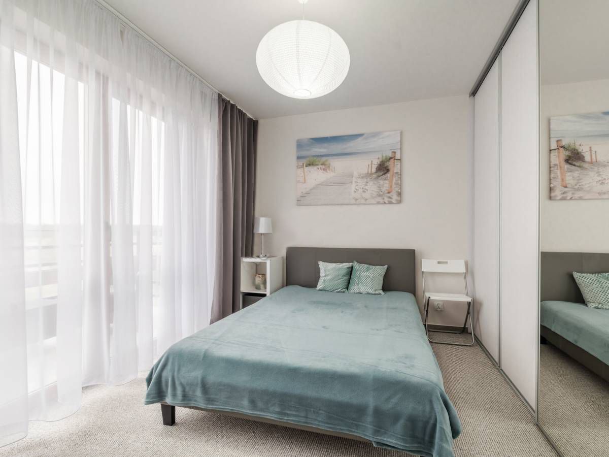 Z sypialni można wyjść na balkon, na którym znajdują się meble ogrodowe: stolik i 2 fotele. Można z niego podziwiać przepiękny widok na łąki, a w oddali widać miasto Łeba.