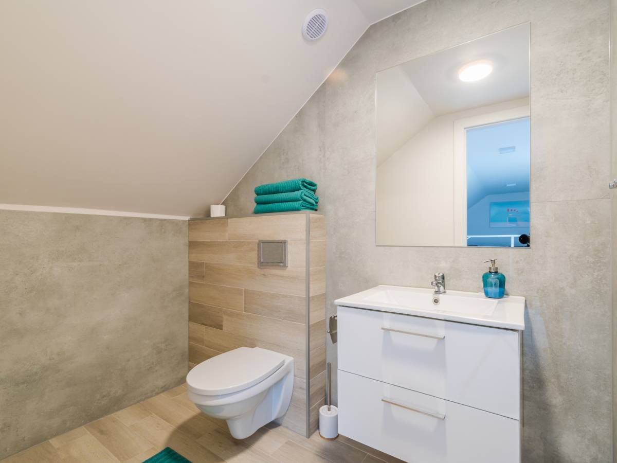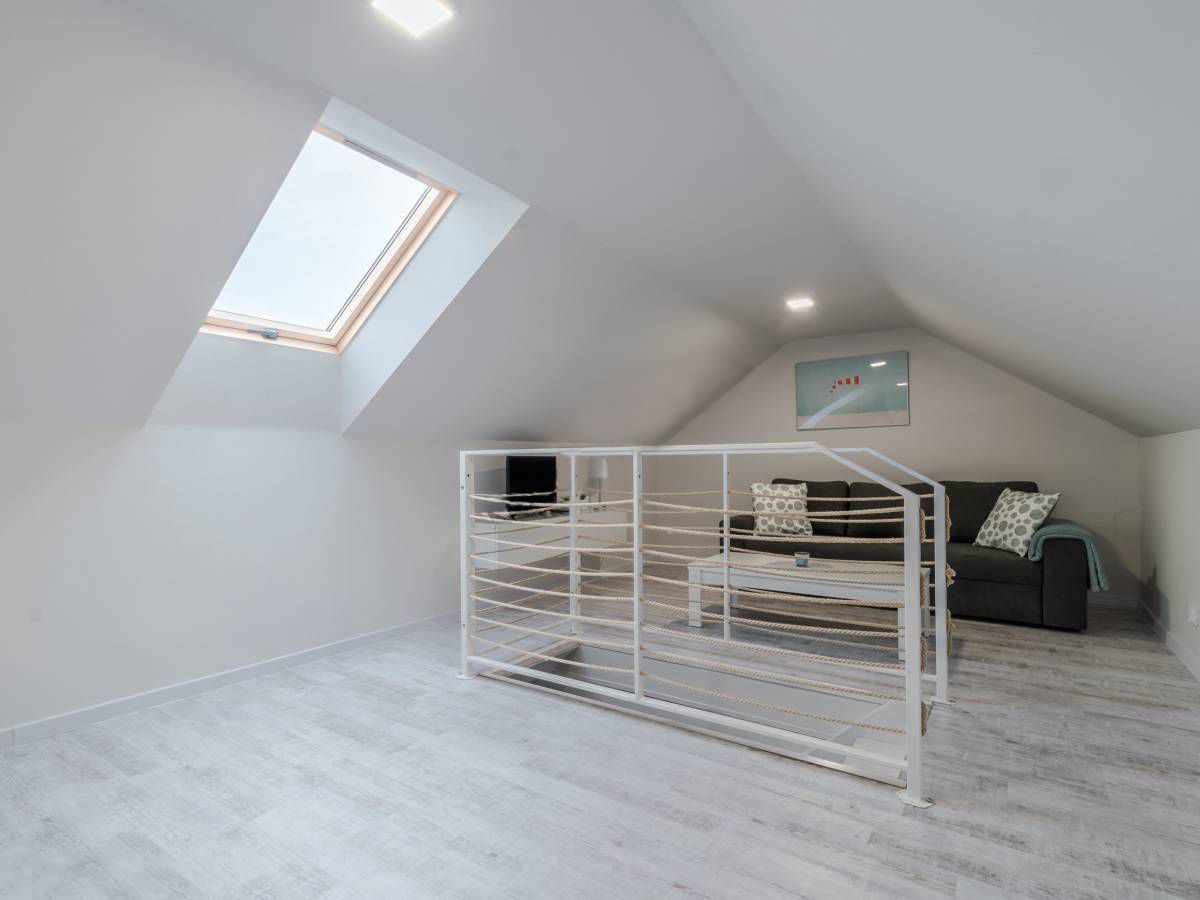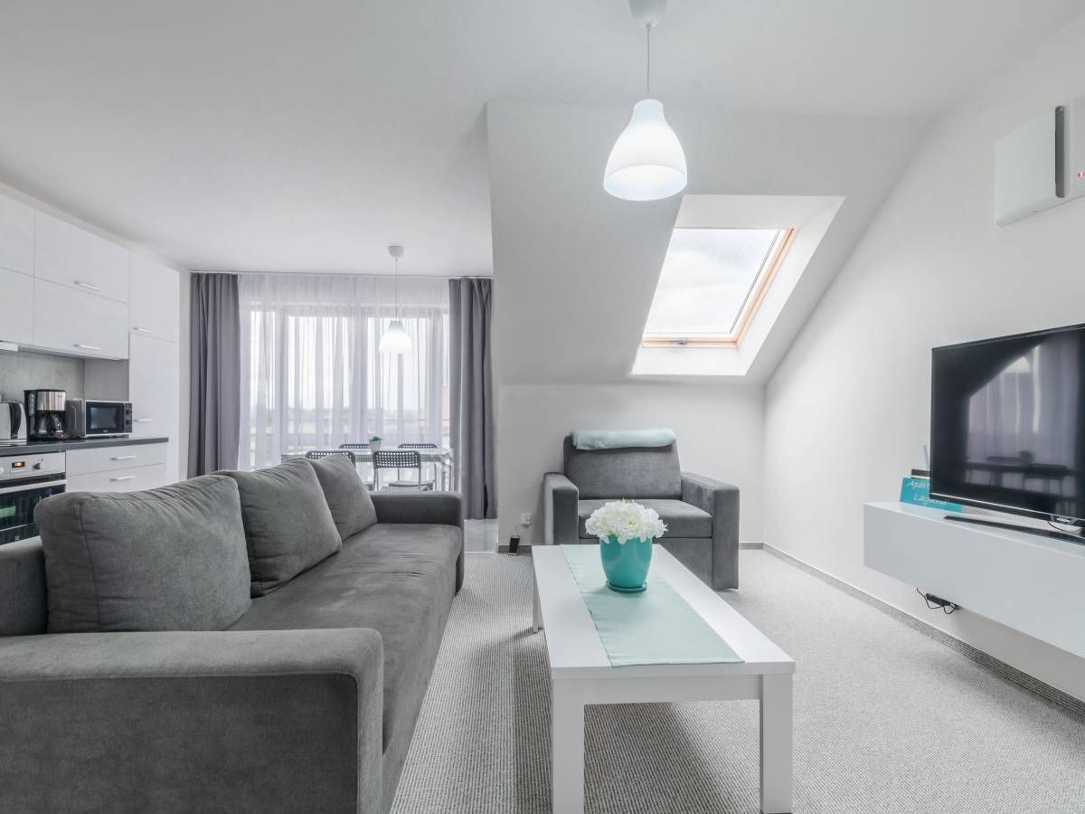 Z sypialni można wyjść na balkon, na którym znajdują się meble ogrodowe: stolik i 2 fotele. Można z niego podziwiać przepiękny widok na łąki, a w oddali widać miasto Łeba.